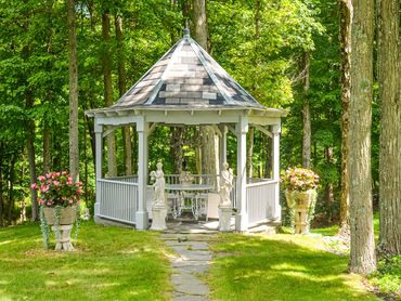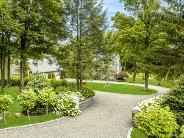 Entrance is through a stone gate, over a flowing stream, alongside waterfalls, fountains, and perennial gardens. A scenic tree-lined driveway leads to the exquisitely furnished Main Residence, Studio-loft Apartment, and Guest House.