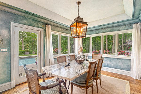 A separate formal dining room with skim-coated decorative walls, and glass door leads to the pool and outdoor entertainment terraces.