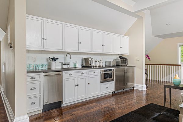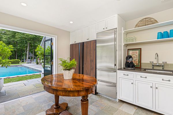 Below the apartment is the pool house with a kitchenette, full bath, laundry facilities, temperature-controlled wine coolers, Subzero refrigerator, and full-sized cabinets. Attached to the pool house is a garage and utility area with a private/service half-bath.